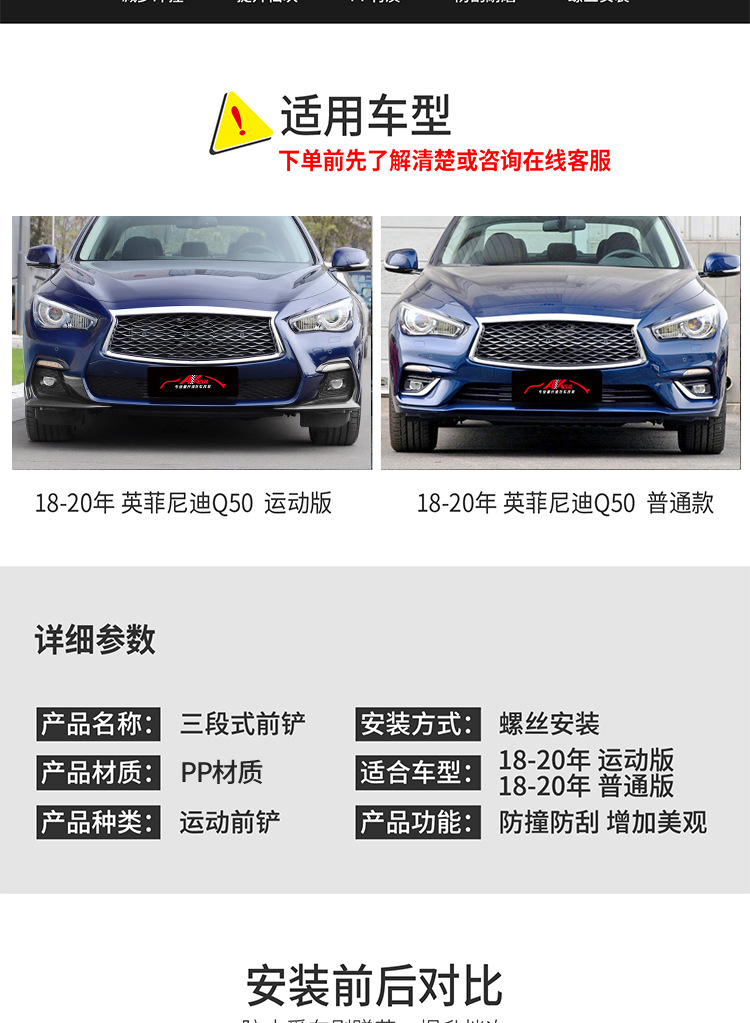 直供适用于2014-2022款英菲尼迪Q50L改装三段式前铲前唇前杠